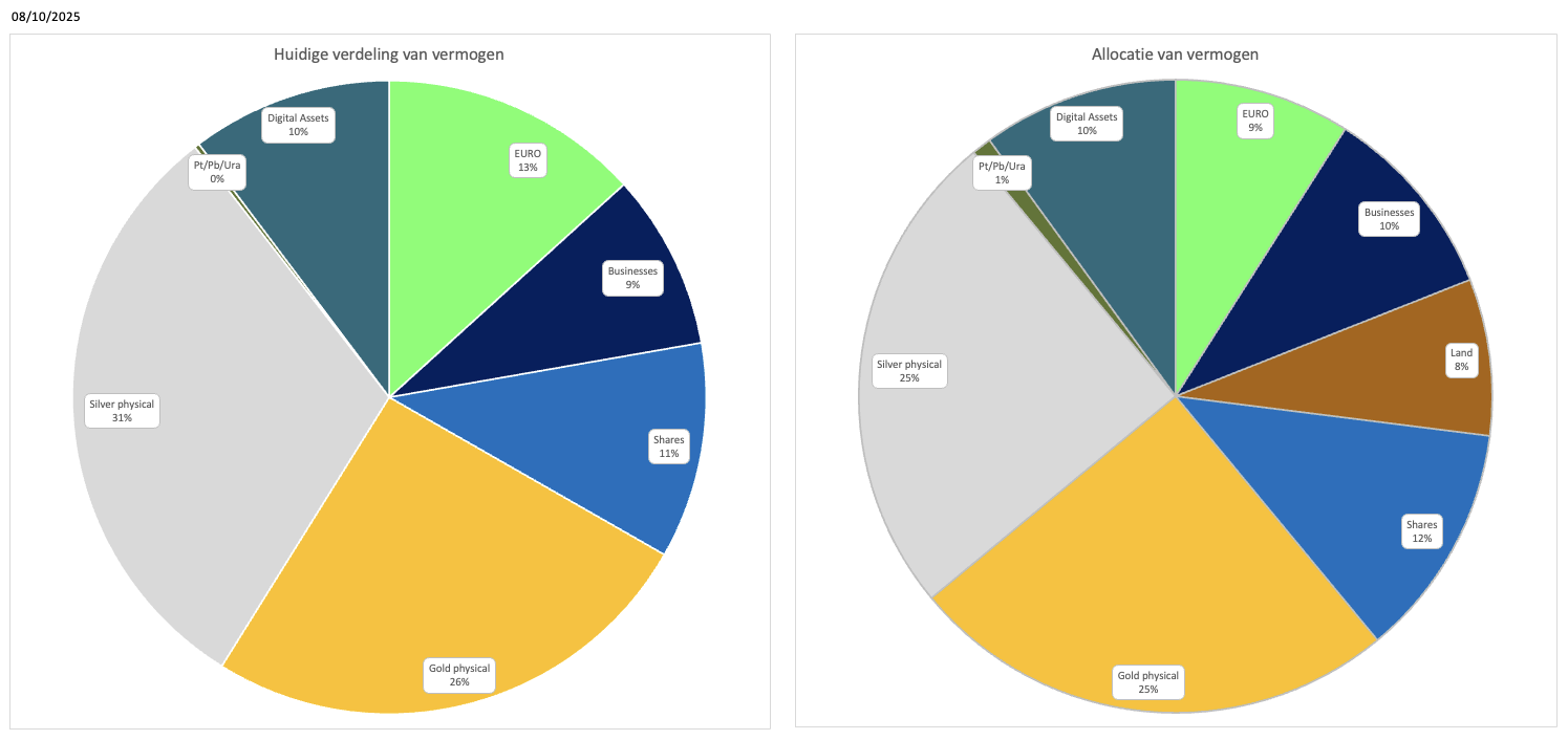 Hieronder ziet u onze huidige posities (wat wij nu bezitten) en onze allocatie, onze strategie (wat wij willen bezitten):
